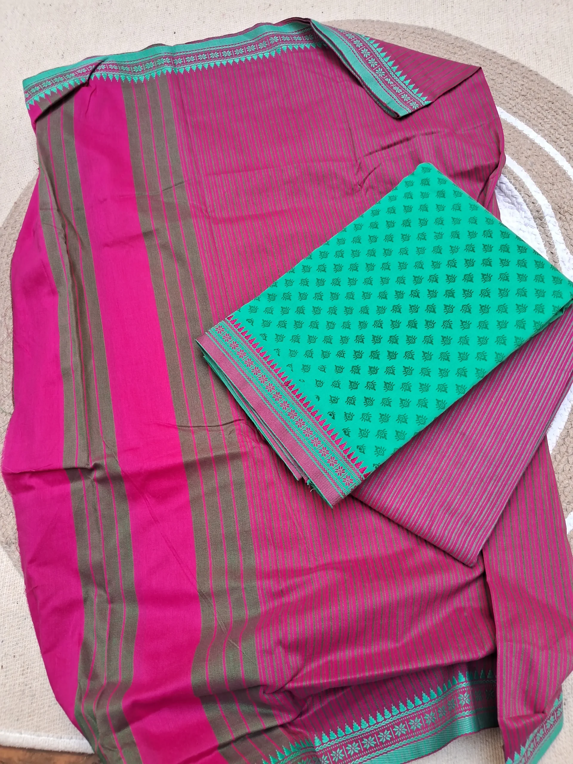Teal green and pink Puneri Cotton Dressmaterial