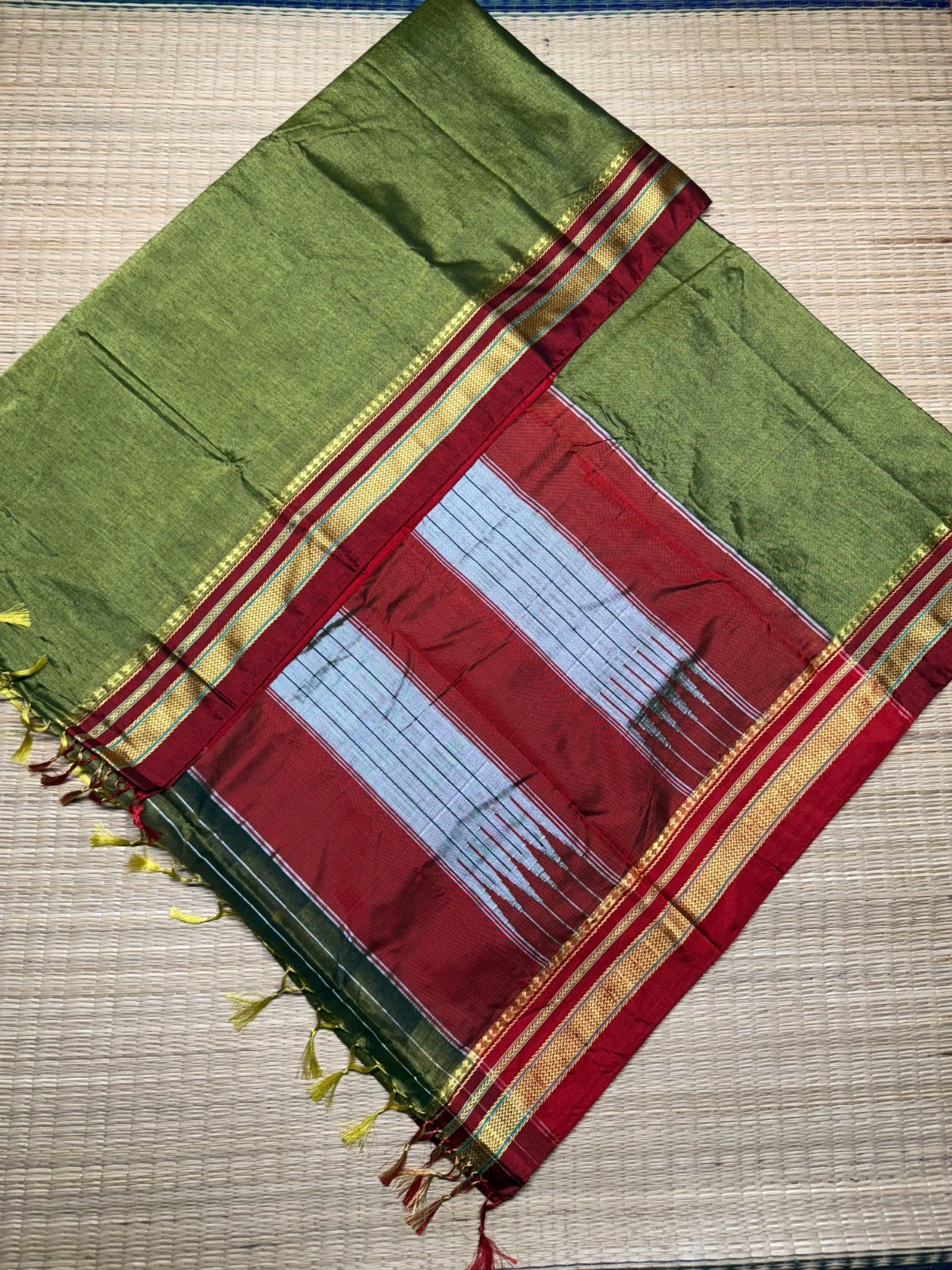 Ilkal sarees originate from the historic town of Ilkal in Karnataka, renowned for its rich weaving tradition. These distinctive sarees feature a cotton silk body paired with elegant borders and a beautifully crafted pallu.