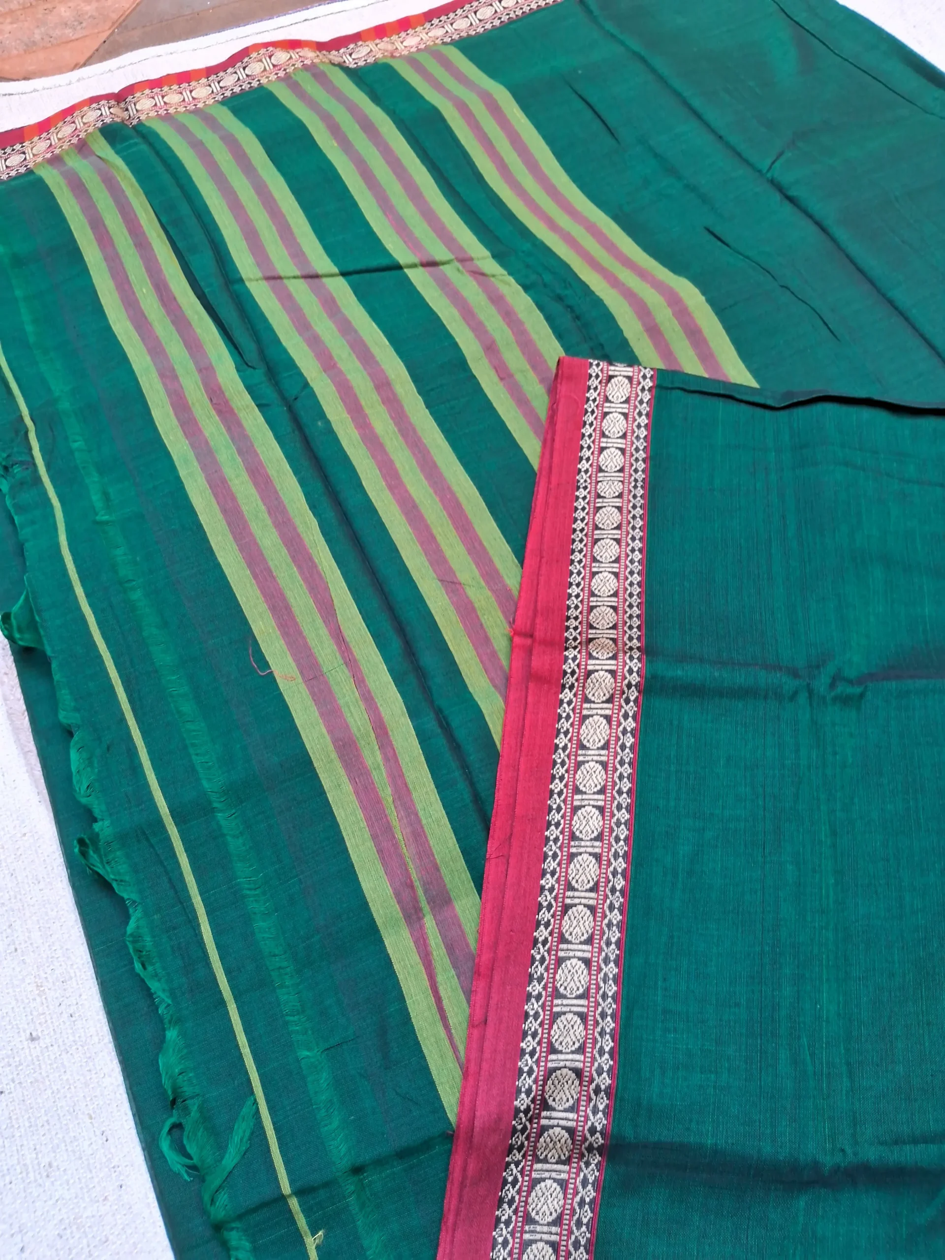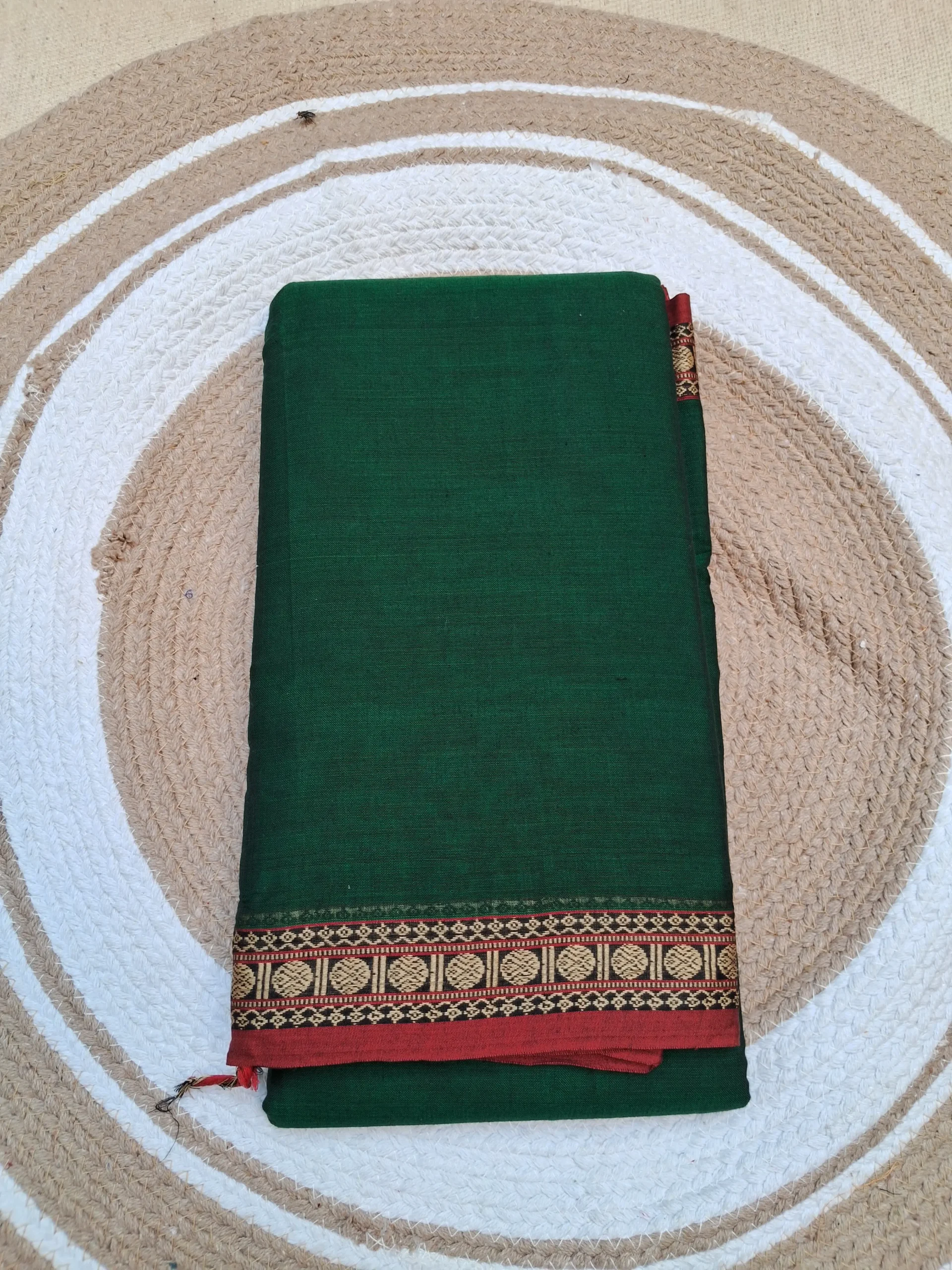 Elegant bottle green Narayanpet cotton saree featuring a classic green border with rudraksh motifs on it and a simple lining pallu.Soft ,breathable and easy to drape- ideal for office wear,casual outings and traditional gatherings.