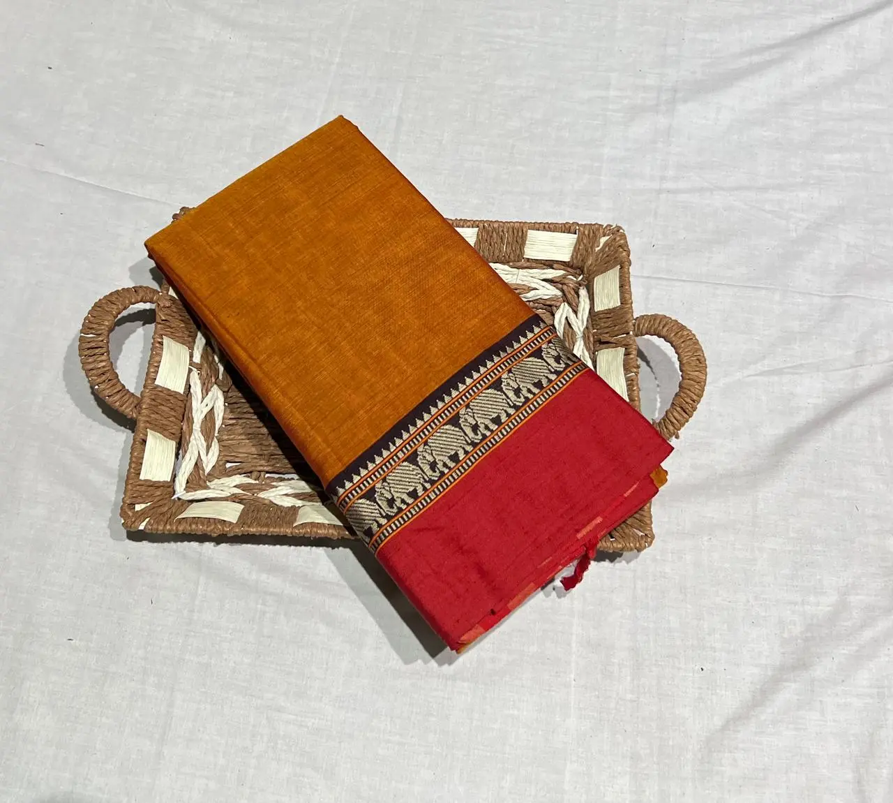 Elegant chrome yellow Narayanpet cotton saree featuring a classic red border with elephant motifs on it and a simple lining pallu.Soft ,breathable and easy to drape- ideal for office wear,casual outings and traditional gatherings.