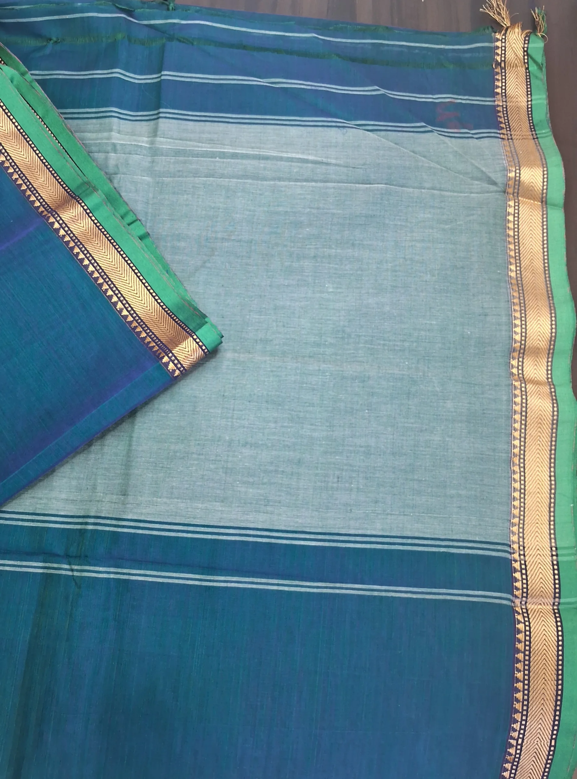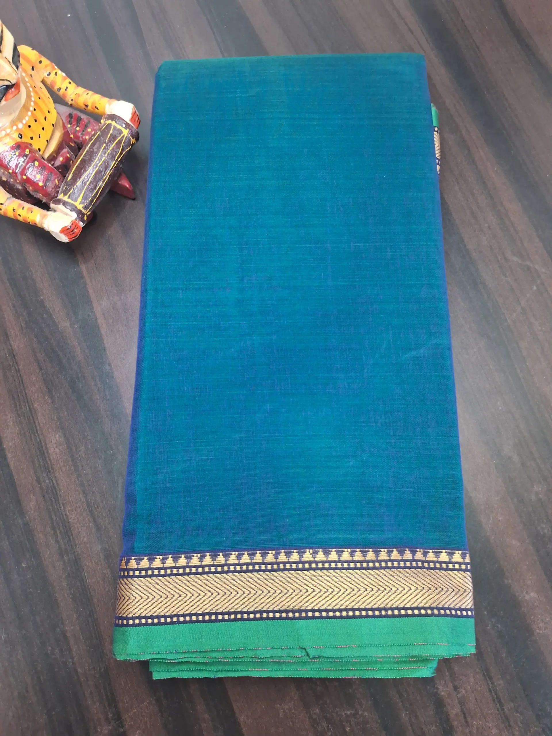 Elegant peacock blue Narayanpet cotton saree featuring a classic golden temple border and a contrast pallu.Soft ,breathable and easy to drape- ideal for office wear,casual outings and traditional gatherings.